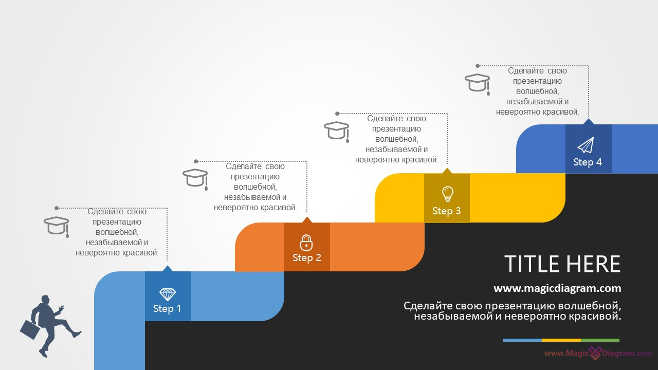 Шаблон Широкие ступени из категории "Разные" — это свобода для ваших слайдов. Он для тех, кто хочет микс идей. В нём 4 деталей: формы, линии, текстовые зоны. Допустим, вы презентуете концепт: тут круг, там стрелка, рядом блок. Добавляете своё, подбираете стиль, и слайд становится уникальным. Это как конструктор для презентаций — собираете, что нужно. Подходит для творческих питчей или обсуждений. С Широкие ступени не заскучаешь: подстраиваете, и готово. Его просмотрели 14 623 раз — людям нравится эта гибкость. Шаблон инфографики для презентации "Широкие ступени" можно использовать в различных вариациях для презентаций на разные темы. Все элементы в этом шаблоне редактируются, и вы можете легко и быстро изменить их количество, размер, цвет, положение и форму под ваши потребности. В этом шаблоне для презентации PowerPoint присутствуют ступени лестница иконки.Эта инфографика предназначена для использования в программе PowerPoint или в сервисе google slides (гугл презентации). Выбранный вами шаблон презентации, вы можете скачать в формате 16х9, но его можно скопировать и вставить на слайд любого другого формата. Вы можете скачать этот шаблон для презентации с нашего сайта бесплатно и без регистрации.